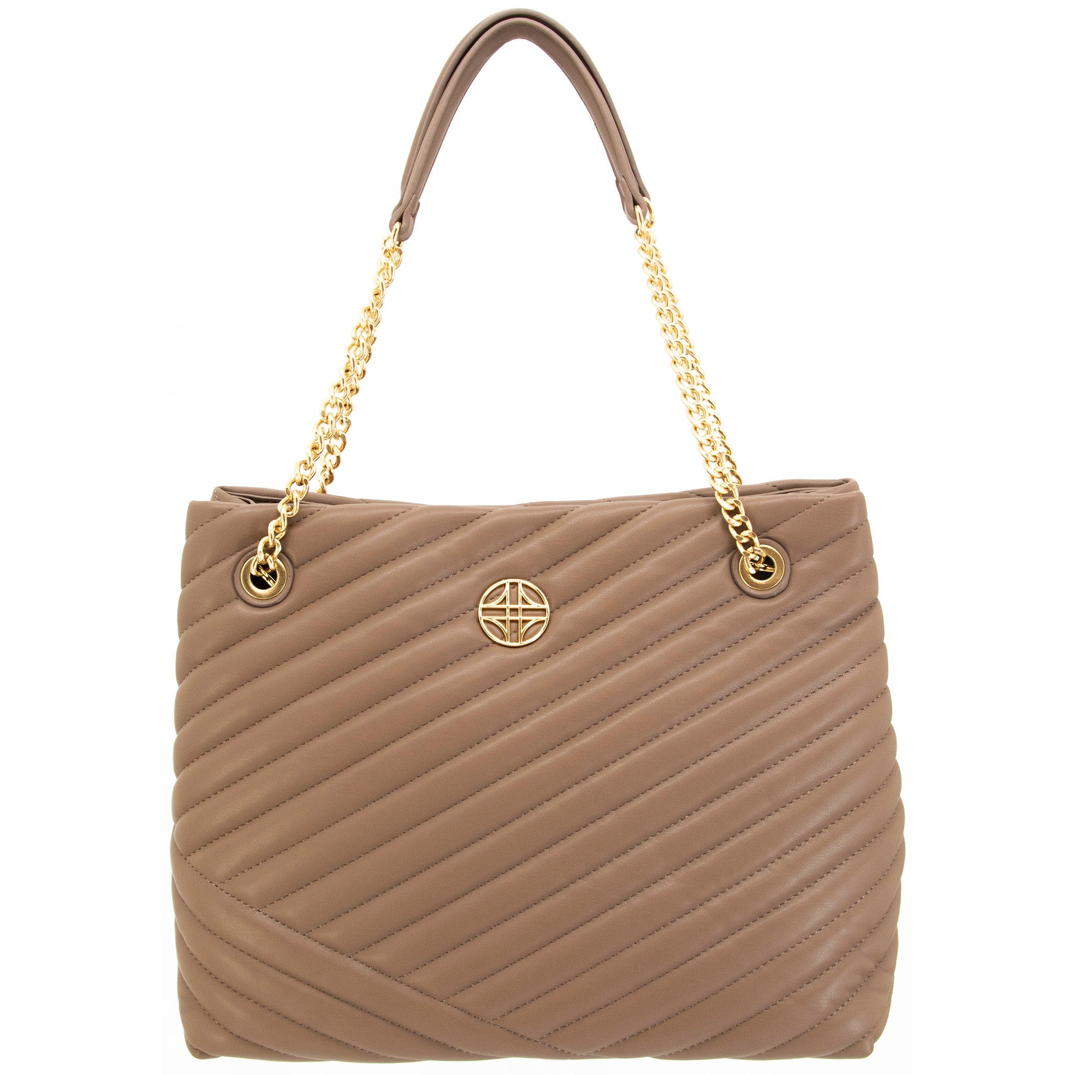 Flora is vegan leather, quilted tote featuring an open-top with snap tab closure and gold medallion detail. It has parallel, vegan leather handled, curb chain straps, and expanding side panels with snaps.